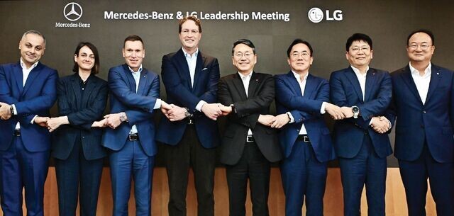 Senior executives of LG Group and Mercedes-Benz pose for a commemorative photo at LG Twin Towers in Yeouido, Seoul, on November 13. The two sides agreed to strengthen comprehensive cooperation in future mobility and automotive electronics. (Photo courtesy of LG Electronics)
