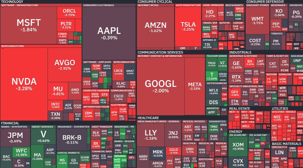 기술주 중심의 성장주가 큰 타격을 받았습니다. 엔비디아와 테슬라는 3% 이상 급락했고, 알파벳·메타·마이크로소프트도 2% 안팎으로 하락했습니다.