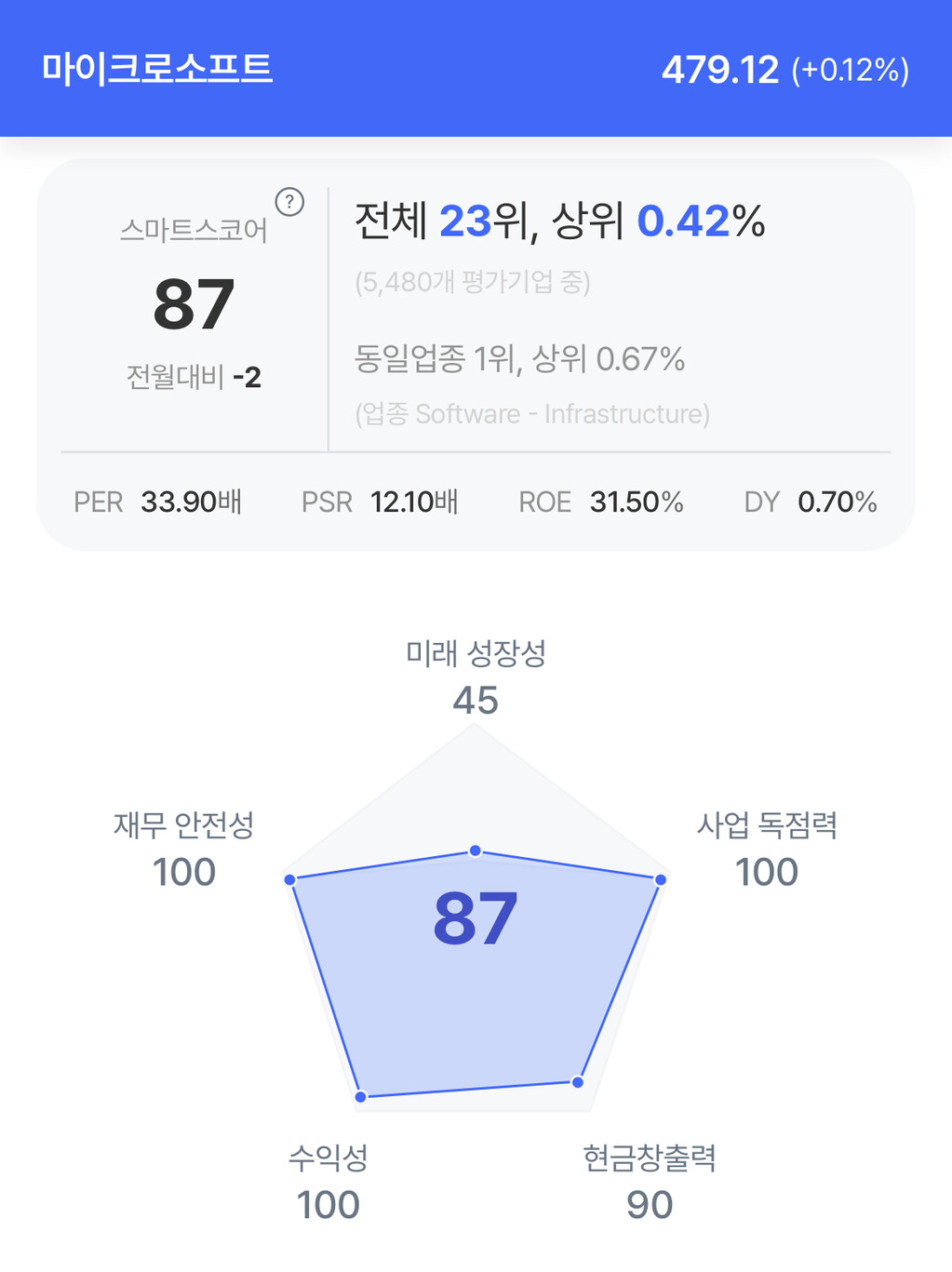 마이크로소프트 주가는 0.12% 상승한 479.12달러로 마감했다.