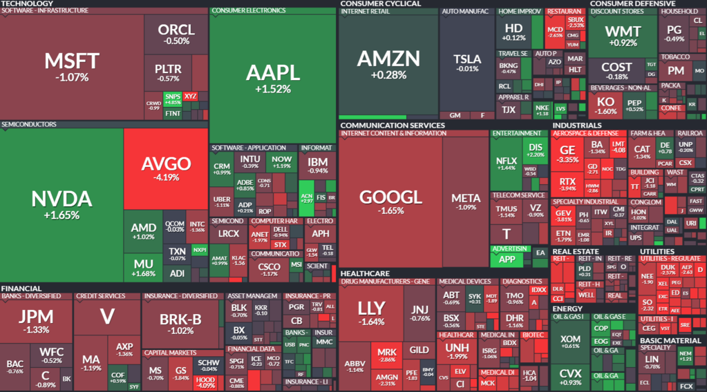 애플은 연말 아이폰 특수 기대감 속에 1.5% 올랐습니다. AMD와 마이크론도 1% 넘게 올랐습니다. 반면, 브로드컴은 4% 넘게 하락했습니다.