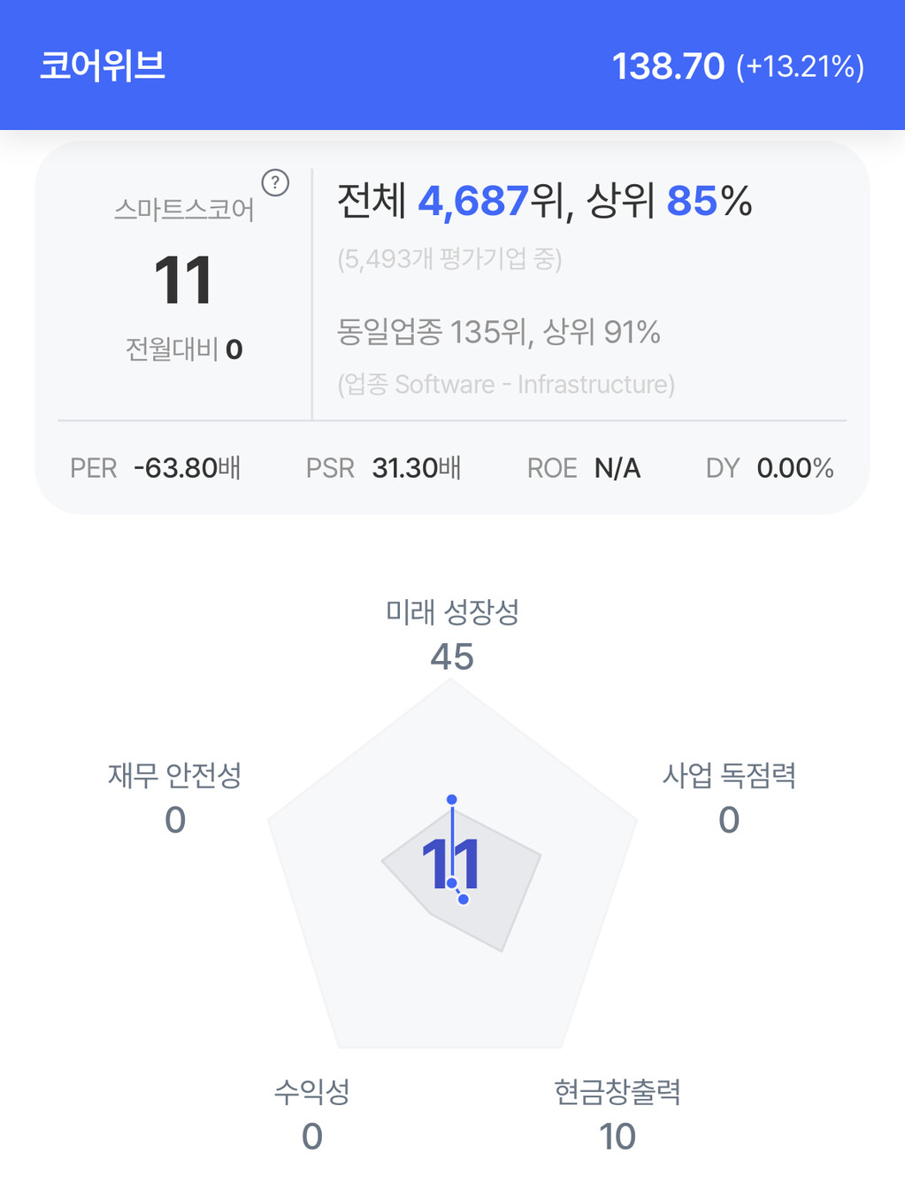 코어위브 주가는 13.21% 급등한 반면 메타 주가는 1.14% 하락했다.