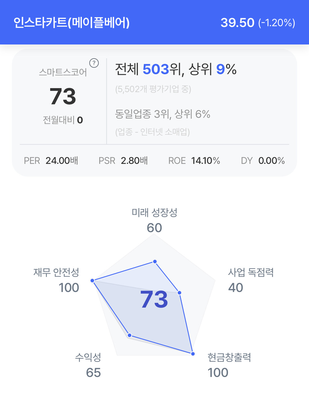 주가는 39.50달러로 1.20% 하락 마감했다.