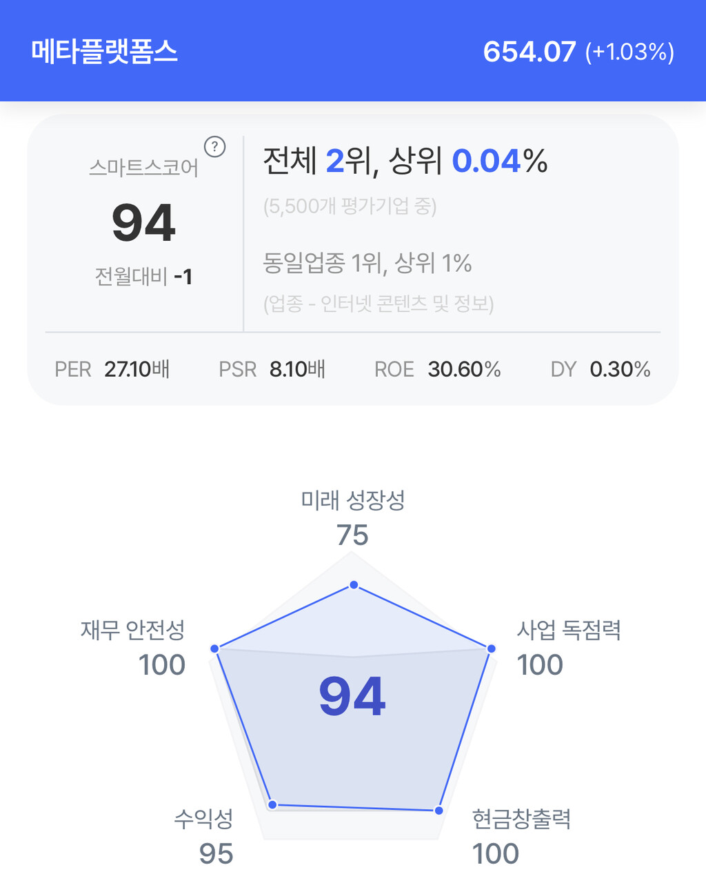 메타 주가는 654.07달러로 1.03% 상승 마감했다.
