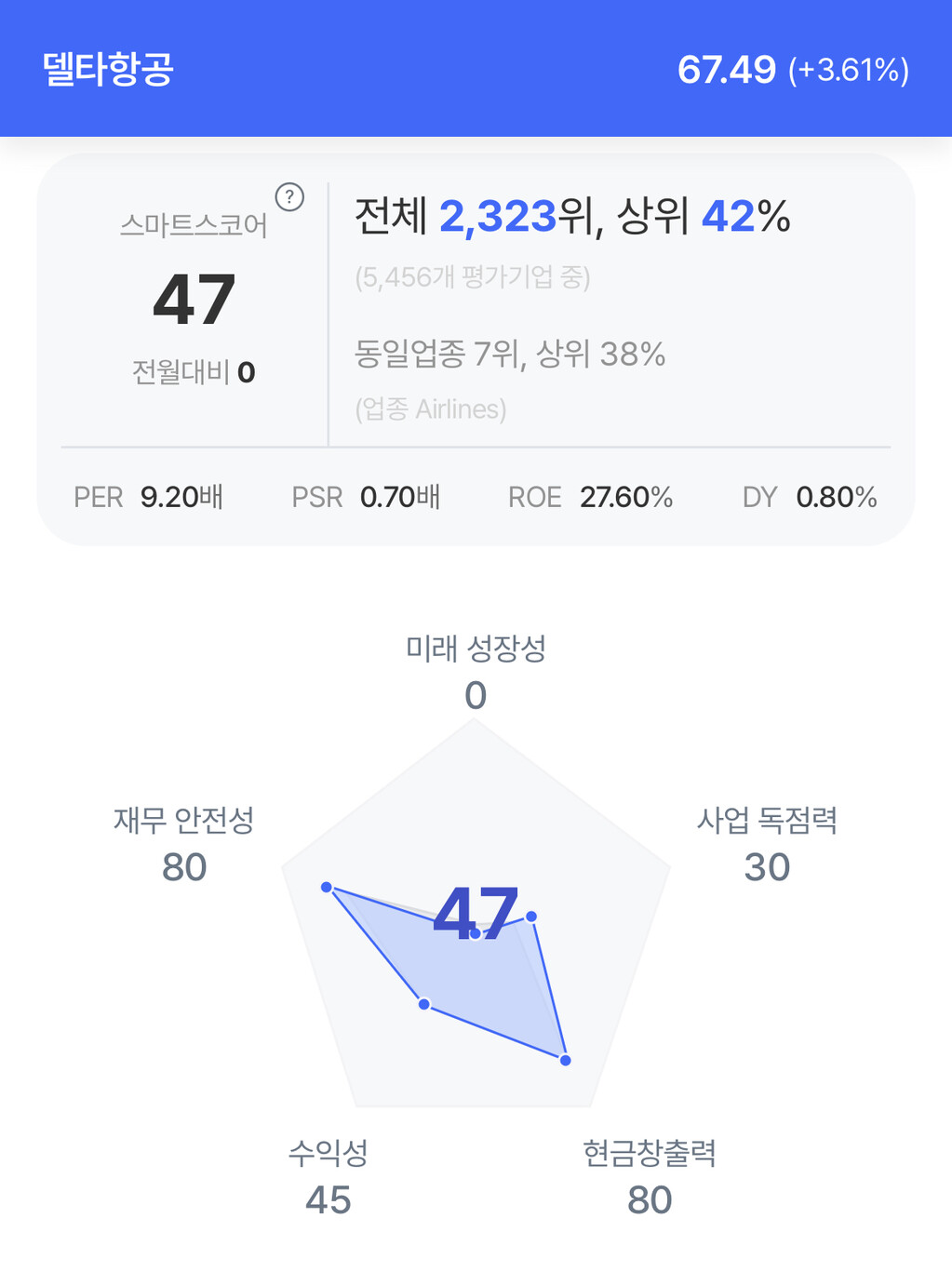 델타항공 주가는 67.49달러로 3.61% 상승 마감했다.