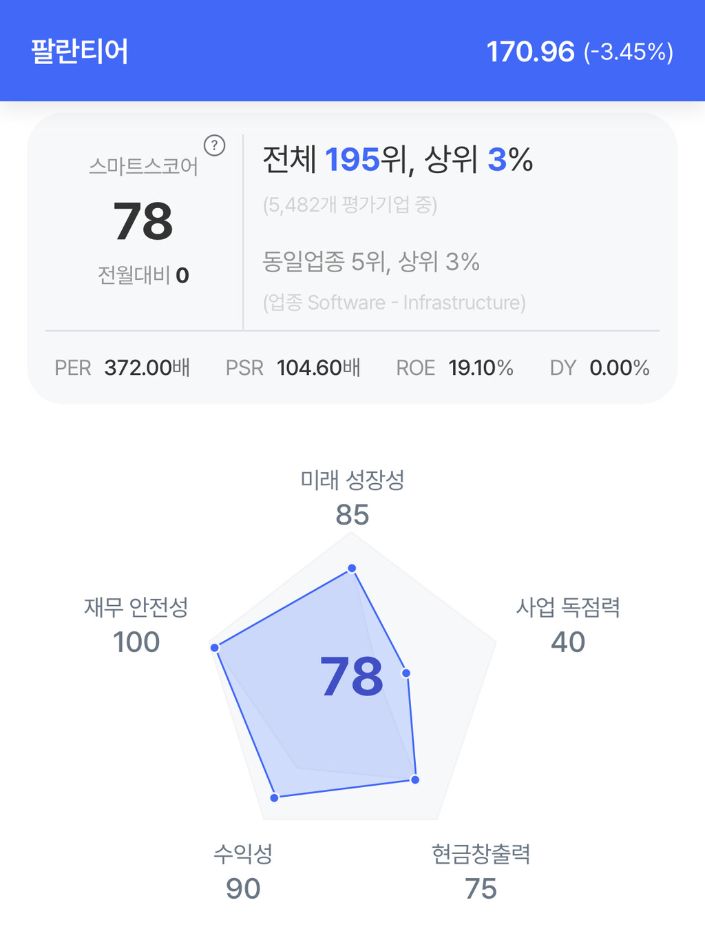주가는 170.96 달러로 3.45% 하락 마감했다.
