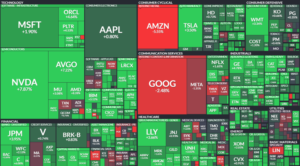반도체 기업들이 상승을 이끈 가운데 엔비디아가 7.8%, 브로드컴은 7.1% 급등했습니다.