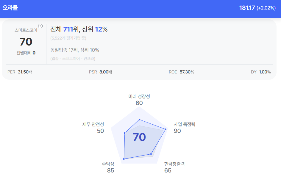 오라클의 12개월 선행 자기가본이익률(ROE)는 35.0%로 동종기업대비 높은 수준을 유지 중이다.