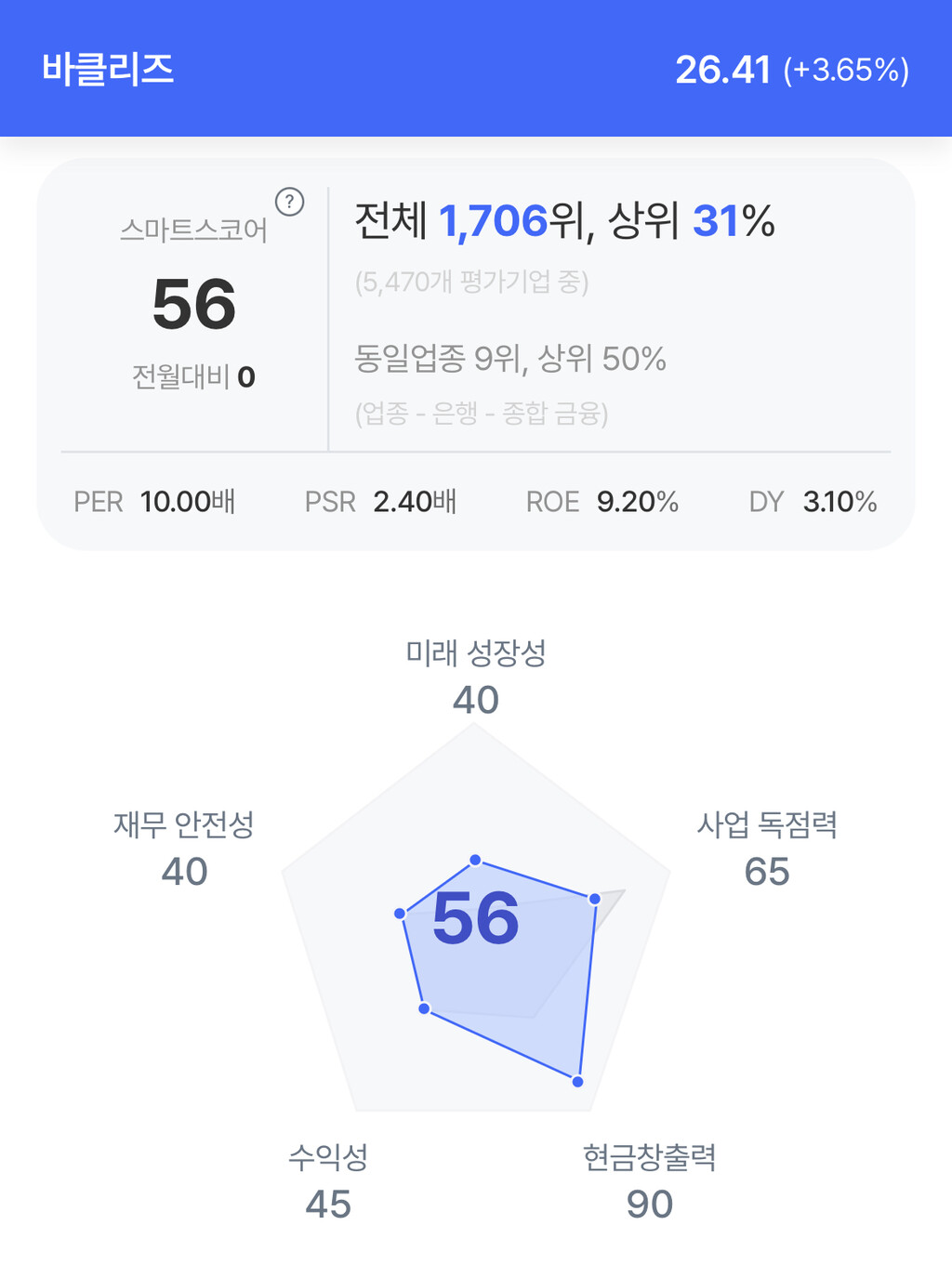 바클리즈 주가는 26.41달러로 3.65% 상승 마감했다.