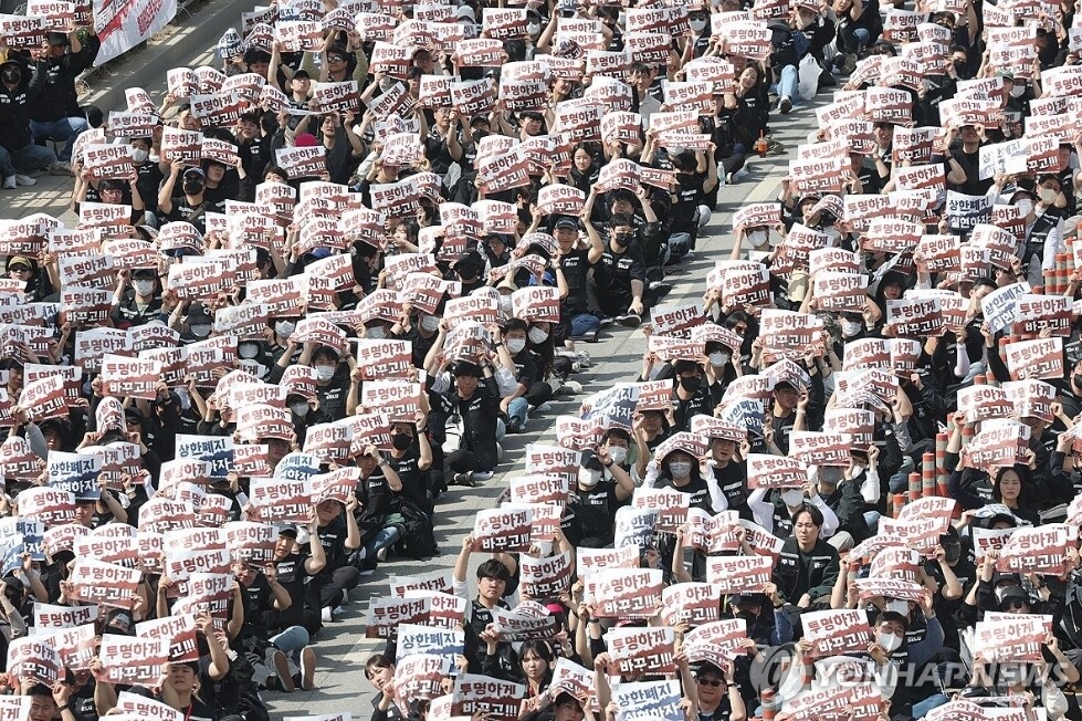 23일 경기도 평택시 삼성전자 평택캠퍼스 앞에서 열린 삼성전자 노동조합 공동투쟁본부의 '투명하게 바꾸고, 상한폐지 실현하자-423 투쟁 결의대회'에서 조합원들이 구호를 외치고 있다. (사진=연합뉴스)