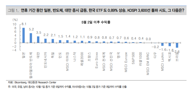 대신증권은 연휴 동안 미국 증시의 상승을 감안할 경우 코스피는 3600선 돌파 시도가 가능하다고 봤다.