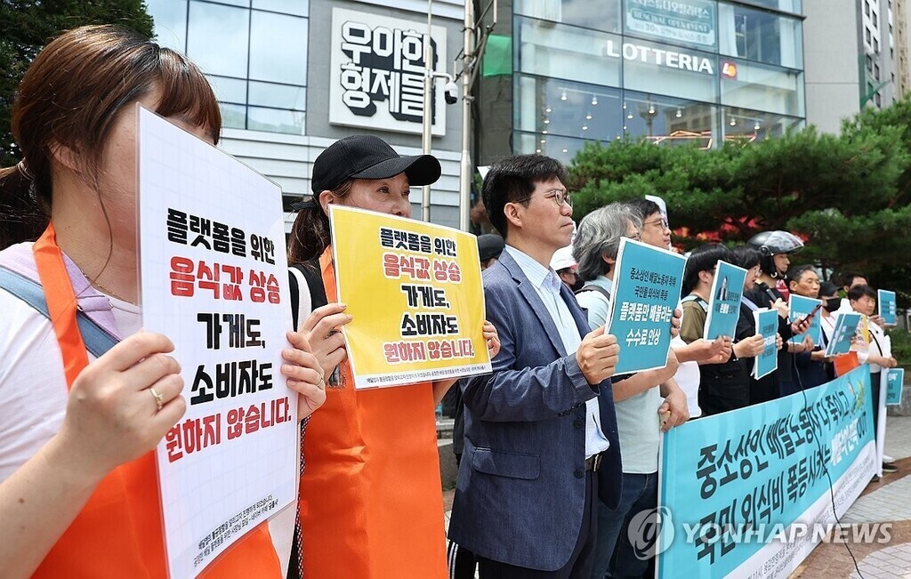 | 15일 오전 서울 송파구 우아한형제들 본사 앞에서 라이더유니온, 공정한플랫폼을위한사장님모임, 서비스연맹 배달플랫폼노조 관계자 등이 배달의민족 수수료 인상 규탄 및 철회 촉구 기자회견을 하고 있다. (사진=연합뉴스) |