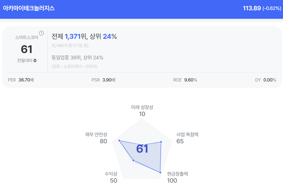 | 아카마이테크놀러지스 종목진단 (출처=초이스스탁) |
