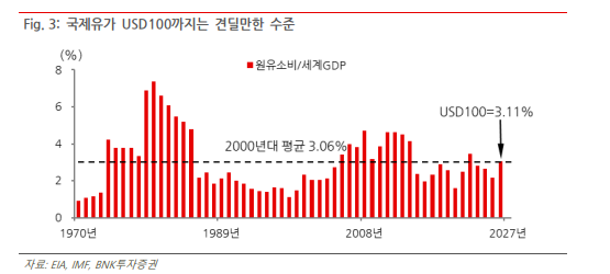 BNK투자증권에 따르면, 이란전쟁으로 인해 공급 차질에 대한 우려로 국제유가가 배럴당 100달러를 넘어섰다. 현재 유가 수준이 지속될 경우 세계GDP에서 원유소비가 차지하는 비중이 3.1%로 추정되는데, 이는 2000년대 평균을 소폭 상회하는 수준이다.