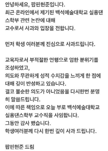 팝핀현준은 지난 13일 자신의 사회관계망서비스(SNS) 계정을 통해 "오늘부로 백석예술대학교 실용댄스학부 교수직을 사임한다"며 "학생 여러분께 진심으로 사과드린다"고 밝혔다.