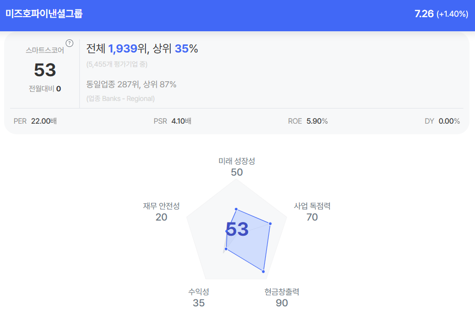 | 미즈호파이낸셜그룹 종목진단 (출처=초이스스탁) |