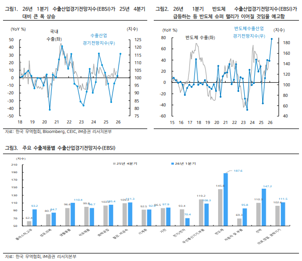 IM증권에 따르면, 2026년 1분기 수출산업경기전망지수(EBSI) 115.8은 지난 2024년 3분기 116.0 이후 최고치다. 참고로 2024년 3분기 수출 증가율은 전년동기 10.5%의 두자리 증가폭을 기록한 바 있다.