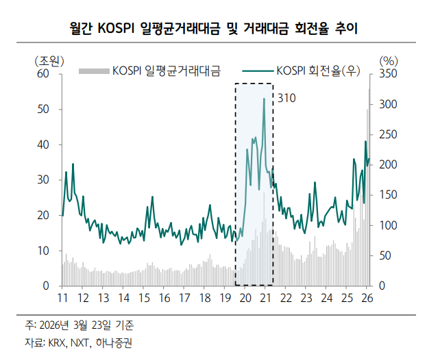 고연수 하나증권 연구원은 "2026년 1~2월에는 ETF 중심의 투자 확대가 회전율 둔화 요인으로 작용했으나, 최근 개인 ETF 순매수가 축소되는 반면 개별 종목으로의 매수세가 본격화되기 시작했다"라며 "이는 향후 거래 회전율이 추가적으로 상승할 수 있음을 시사한다"라고 말했다.