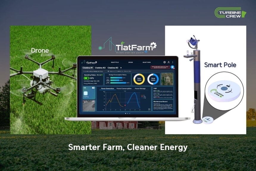 국내 스타트업 터빈크루는 드론, 스마트폴, 원격 제어 기술을 결합한 농작물 자동 모니터링 시스템 '틀랫팜'을 선보인다.