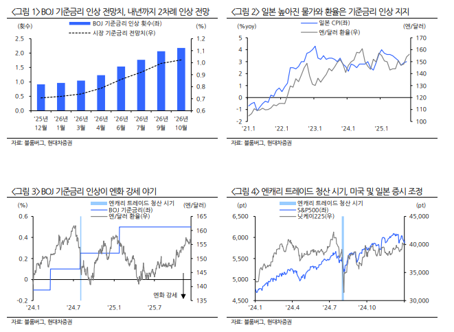 정성태 삼성증권 연구원은 "BOJ가 11개월 만에 금리 인상을 재개할 전망이 우세하면서, 금융시장 일각에서는 지난해 7월과 같은 엔 캐리 트레이드의 청산 가능성을 우려하고 있다"고 진단했다.