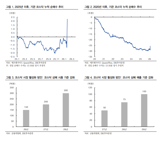 변준호 IBK투자증권 연구원은 "기관의 전례없는 코스닥 대규모 순매수 의미에 대해 고찰할 필요가 있다"며 "이런 흐름은 일시적이기보다 의미 있는 변화 가능성이 높다"고 풀이했다.