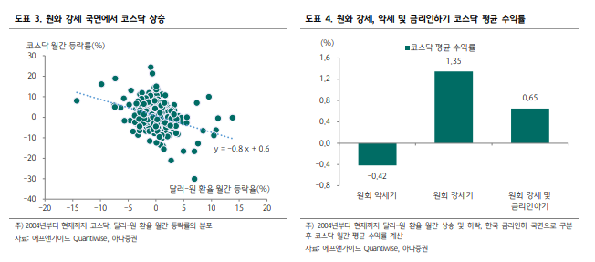 하나증권에 따르면, 코스닥 지수는 원화 강세 국면에서 강하며 특히 금리인하기와 맞물리면 월평균 0.7% 상승을 기록한다.