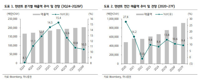 하나증권에 따르면, 텐센트의 2025년 4분기 매출은 중국 소비 경기 약화에 따른 광고/핀테크 매출 성장률 둔화로 3분기 대비 둔화된 13% 성장이 추정된다.
