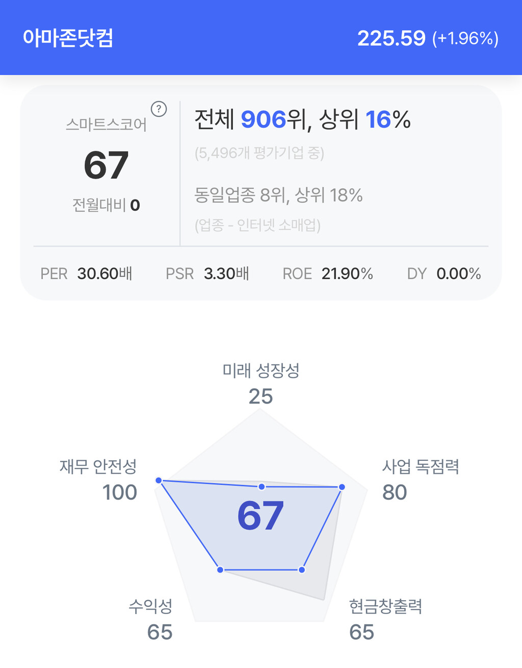 아마존 주가는 225.59달러로 1.96% 상승 마감했다.