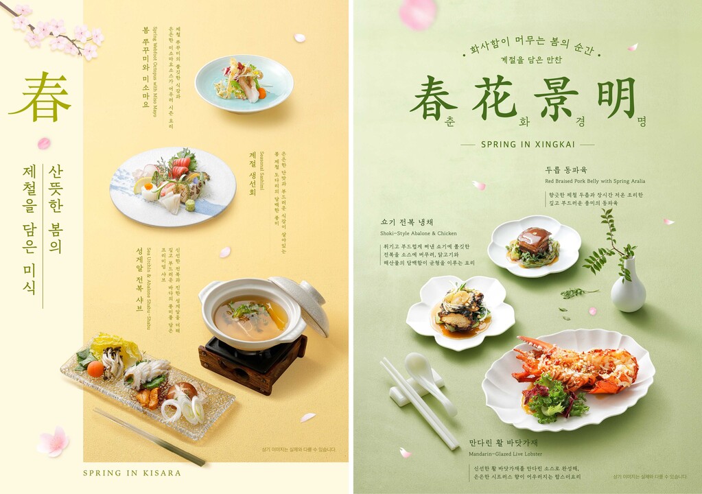 ​중식당 싱카이는 봄의 화창한 풍경을 의미하는 ‘춘화경명(春和景明)’ 코스를 선보인다. 쇼기 전복 냉채, 동충하초 샥스핀찜, 오룡해삼, 만다린 활 바닷가재 등 해산물 중심 메뉴와 향긋한 봄 두릅을 곁들인 두릅 동파육 등을 구성했다.