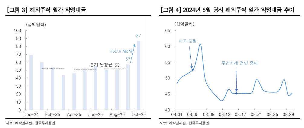 백 연구원은 "작년 8월 6300억원 주문취소 사태 이후 중단되었던 미국 주식 주간거래도 11월 4일부터 재개된다"라며 "최근의 우호적 투자심리, 시장의 주요 투자 포인트가 관세 타결 등 국내외 증시를 모두 포괄하는 점, 올해 3월부터 국내 증시 거래시간이 확대된 점까지 고려하면, 미국 주식 주간거래 실시로 인한 국내외 주식 거래대금 증가 유발효과는 작년 대비 클 것"으로 전망했다.