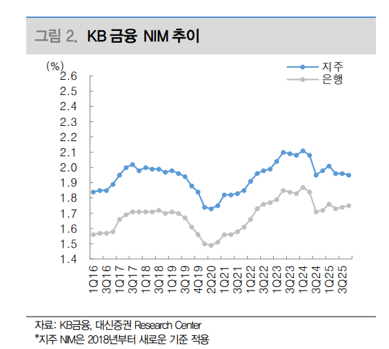 박혜진 대신증권 연구원은 "총 환원율 50% 조기달성, 배당소득분리과세, 감액배당 주총 결의 예정 등 환원을 위한 3대 조건 및 총 환원액 3조600억원이라는 압도적인 실적을 달성하며 업종 1위사의 명성을 다시 한번 증명했다"라며 "CET1비율에 따른 총 환원율 상단을 제한하지 않는 기존 정책은 여전히 고수하고 있으며 따라서 4분기와 마찬가지로 2026년 시장의 예상을 뛰어넘는 환원액을 기대할 여지가 존재한다"라고 말했다.