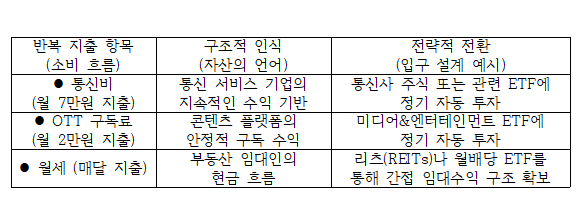 예를 들어, 통신비나 스트리밍 구독료처럼 매달 나가는 반복 지출을 해당 산업군(통신서비스, 미디어&엔터테인먼트)을 추종하는 ETF에 일정 비율만큼 정기적으로 자동 투자하도록 설정하는 것이다. 이렇게 소비의 자동 흐름을 투자로 전환하는 시스템을 만들면 돈의 흐름은 통제할 수 없는 환경이 아니라, 내가 설계한 순환 구조가 된다.