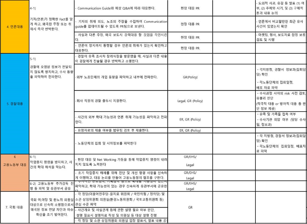 국회의 경우 여야당 및 환노위 의원실 대상으로 신속히 소명함으로서 왜곡된 정보 전달 차단 및 이슈 확산을 조기 방어한다고 나와 있다.