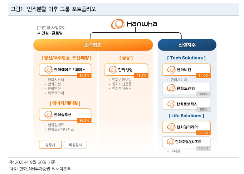 분할존속법인(한화)은 방산, 조선, 해양, 에너지, 금융과 자체사업인 건설과 글로벌부문 등으로 구성되는데 주요 자회사로는 한화에어로스페이스, 한화솔루션, 한화생명 등이 있다.