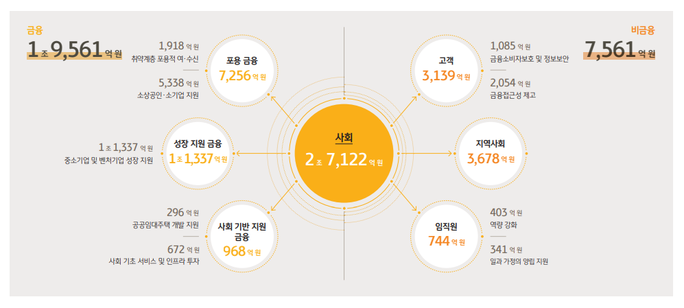 사회 부문에서는 총 2조 7122억원의 사회적 가치를 창출했다. 포용 금융 7256억 원, 성장 지원 금융 1조 1337억원, 사회 기반 지원 금융 968억원 등 금융 부문에서의 성과를 냈다.