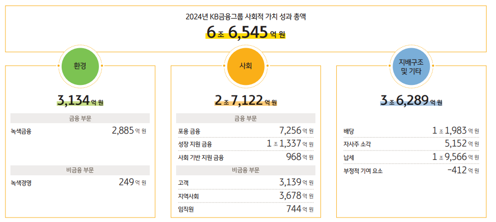 KB금융그룹은 지난해 ▲환경(E) 3134억원 ▲사회(S) 2조7122억원 ▲지배구조(G) 및 기타 3조6289억원 등 총 6조6545억원 규모의 사회적 가치를 창출했다.
