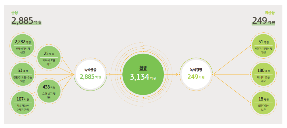 환경 부문에서는 녹색금융 2885억원과 녹색경영 249억원을 포함해 총 3134억원의 사회적 가치 성과를 창출했다.