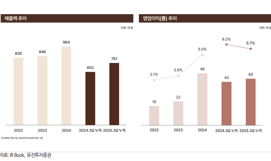매출은 2023년 846억원, 2024년 964억원, 올해는 3분기 누적 761억원이다. 영업이익률은 2023년 2.6%에서 2024년 5.0%, 2025년 3분기 누적 기준 5.7%로 개선세를 보이고 있다.
