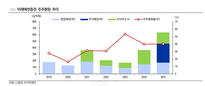 강 연구원은 "주주 입장에서는 높은 멀티플에서의 주식배당은 배정 주식수가 축소되기 때문에 선호하지 않을 수 있지만 주식 교부 이후 바로 처분한다면 배당과 같은 효과를 누릴 수 있다"라며 "주주입장에서는 기존 밸류업 계획에서 발표한 35% 주주환원율을 상회하는 주주환원을 확보하게 되었고, 미래에셋증권 입장에서는 별도자본을 관리할 수 있게 되었다는 점에서 다양한 목적을 충족하였다"라고 판단했다.