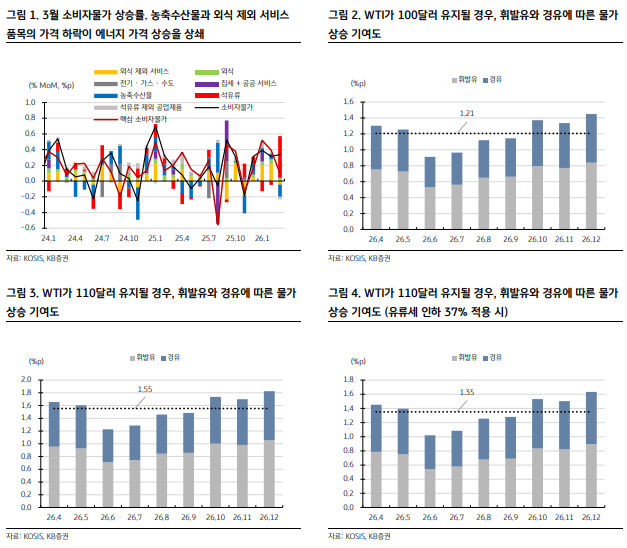 임재균 KB증권 연구원도 "국제유가 상승으로 물가에 대한 부담이 높아졌다"며 "에너지 가격 상승이 나타나고 있고 4월은 상쇄될 품목이 없는 만큼 4월부터 물가의 영향이 본격적으로 나오기 시작할 것"이라고 전망했다.