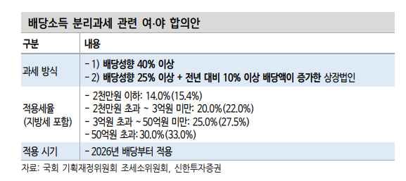 은경완 신한투자증권 연구원은 "지난 7월에 발표된 정부안과 비교하면 50억원 구간을 신설하는 대신 대다수 개인 투자자에게 해당되는 최고세율이 25% 이하로 낮아졌고, 시행 시기도 1년 단축됐다"라며 "반면 고배당 기업 요건은 기존 직전 3년 평균 대비 5% 이상 증가한 법인에서 전년 대비 10% 이상 증가한 법인으로 강화됐다"라고 설명했다.
