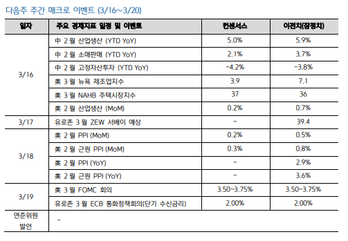 중국 경제지표도 확인해야 할 사항이다. 오는 16일에는 2월 소매판매, 광공업생산 등 실물지표가 발표되며 20일은 LPR 금리결정이 예정되어 있다.