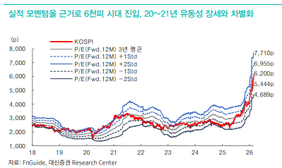 한지영 키움증권 연구원은 "여타 증시 대비 한국 증시의 이익 모멘텀 독주 현상 지속되고 있는 가운데, 상반기 중 영업이익 추가 상향 여력, 낮은 밸류에이션 부담, 3차 상법개정안 통과 이후 ROE 개선 전망 등이 상향 조정의 배경"이라고 분석했다.