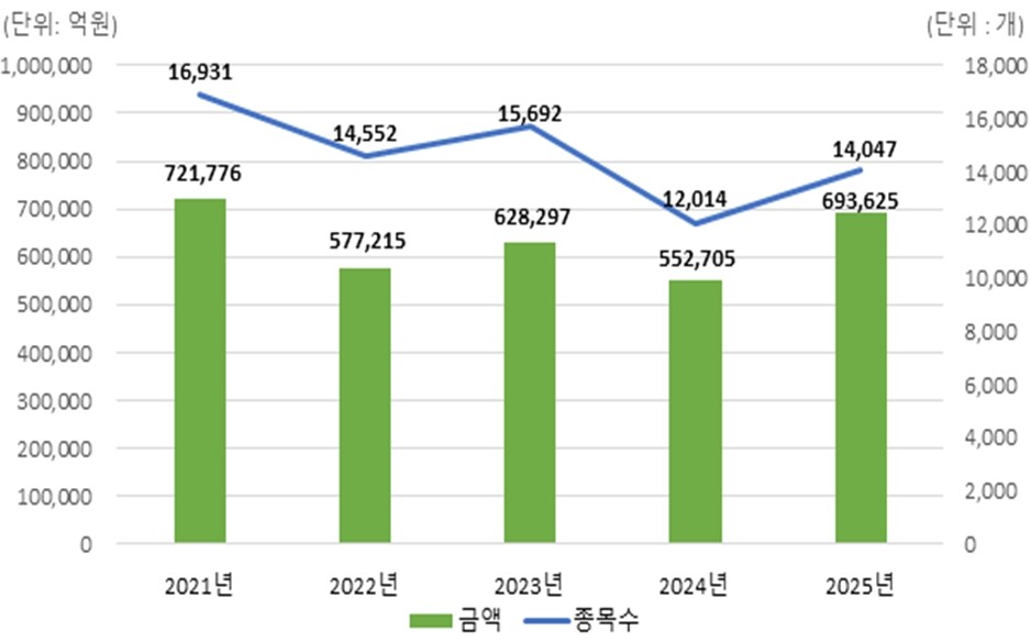 지난해 말 기준 미상환 발행 잔액은 59조4671억원으로, 전년 대비 15.3% 증가했다.