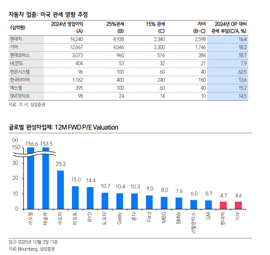 현재 2025년 4분기 기준 현대차와 기아의 관세 부담에 대한 KB증권의 전망치는 각각 1.5조원, 1.3조원이며, 이의 절반 값이 1.5개월분의 관세라고 본다면, 미국 관세율이 25%에서 15%로 낮아질 때 양사의 미국 관세 절감 효과는 각각 3000억 원, 2509억 원에 해당한다는 계산이다.