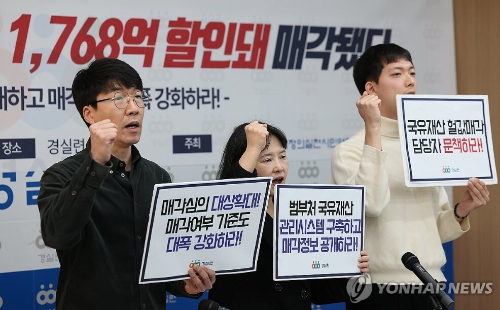 | 경제정의실천시민연합(경실련)이 2일 오전 서울 종로구 경실련 강당에서 연 '국유재산 입찰매각 실태 분석결과 발표 기자회견'에서 참석자들이 구호를 외치고 있다. (사진=연합뉴스) |