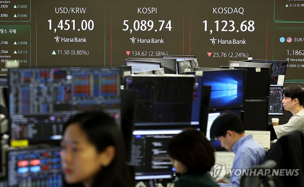 | 코스피가 하락 출발하며 5,100선이 깨진 2일 서울 중구 하나은행 딜링룸 현황판에 코스피와 코스닥지수등이 표시되고 있다. (사진=연합뉴스) |