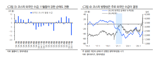 김재승 현대차증권 연구원은 "12월 이후엔 외국인이 코스피 시장에서 점차 순매수에 나설 전망"이라며 "AI 버블에 대한 우려가 완화되고, 미국의 유동성 경색이 완화되면서 원/달러 환율의 변동성도 낮아질 것이기 때문"이라고 분석했다.