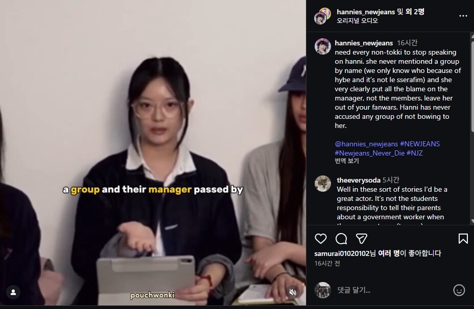 뉴진스 측은 소셜 미디어를 통해 하니가 어떠한 그룹도 비난하지 않았으며, 단지 내부 문제에 대한 책임을 언급한 점을 알렸다. 팬들에게는 감정적인 대립보다는 음악과 활동에 집중해 줄 것을 요청했다.