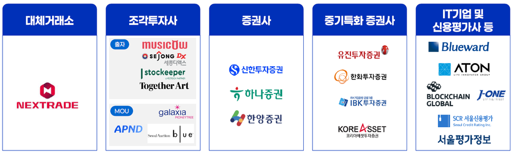 현재 컨소시엄에는 조각투자 시장 운영 경험과 대량의 증권 유통 시스템 구축 역량, 블록체인 및 신용평가 업무 노하우를 보유한 18개 출자기관과 3개 협력기관 등 총 21개 사가 참여하고 있다.