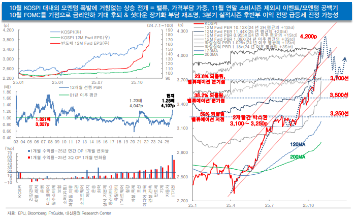 이경민 대신증권 연구원은 "9월, 10월 글로벌 증시 상승은 이상적인 골디락스 국면에 대한 기대가 지속되었기 때문"이라며 "미국 연방 정부 셧다운이 오히려 골디락스 기대를 지속하게 한 상황이었지만 10월 FOMC를 기점으로 금리인하 기대 후퇴, 연방 정부 셧다운 장기화 리스크를 인식했다"고 진단했다.